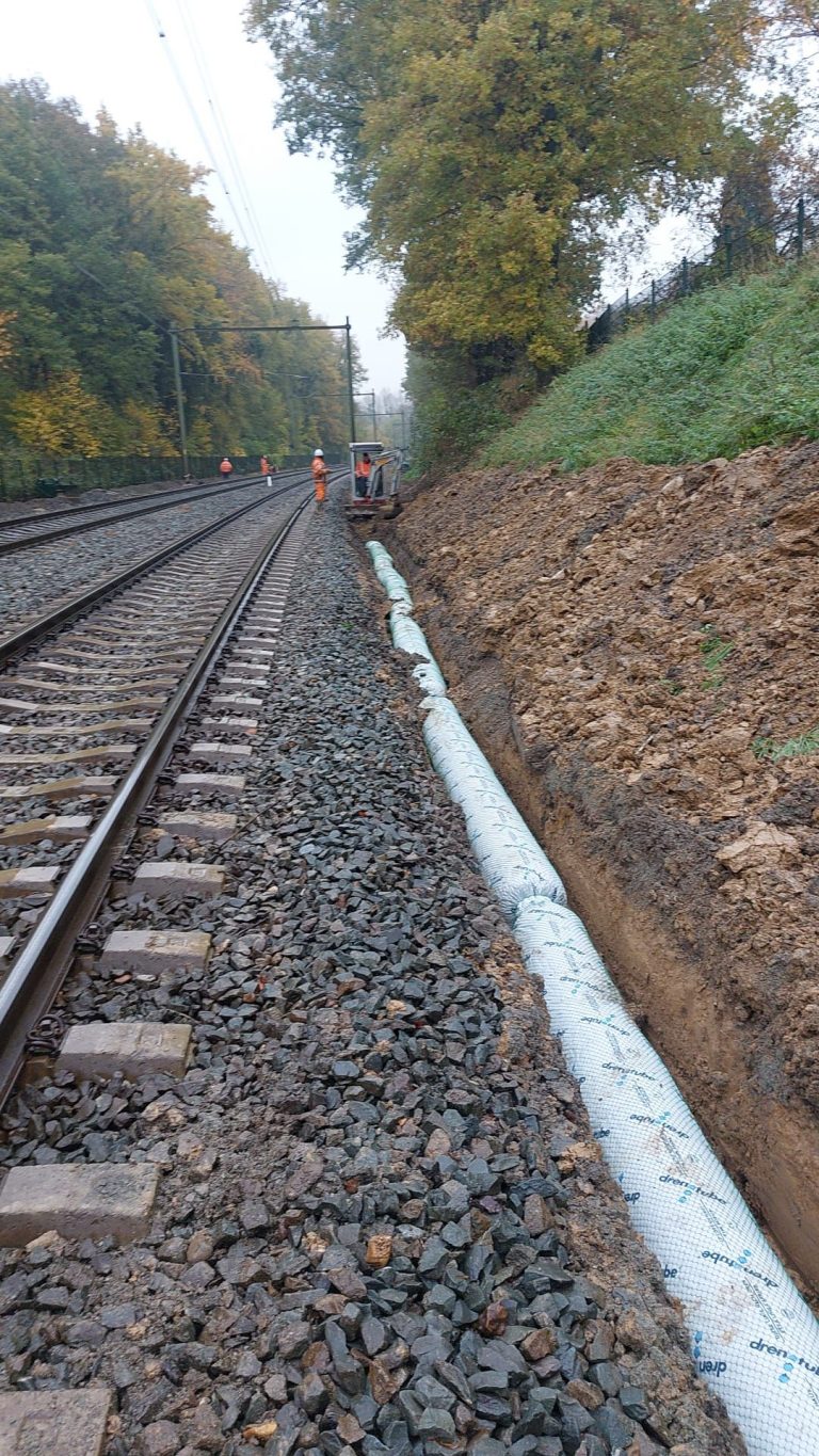 La pose d’un système de drainage ferroviaire doit être adaptée à la géométrie de la voie, à la nature du support et au comportement de l’eau dans l’infrastructure. La documentation Drenotube® indique que le drainage souterrain est généralement implanté parallèlement à la voie, à environ 3 mètres du bord de la voie, avec une profondeur minimale d’environ 90 cm sous le niveau du rail.